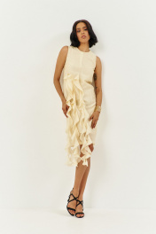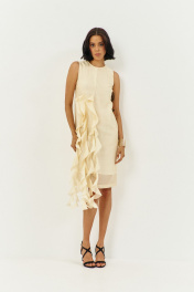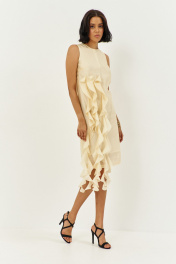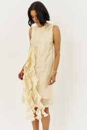 Платье прямого силуэта на подкладке. Характеристики: выполнено из плательной ткани в цвете сливочное масло, по переду декоративные воланы, по спинке потайная застежка-молния. Длина платья 107 см.