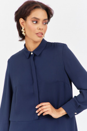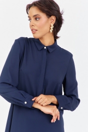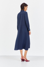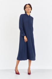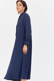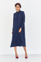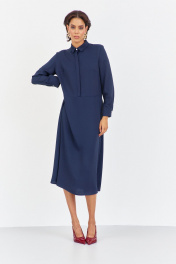 Платье прямого силуэта с потайной застежкой. Характеристики: выполнено из плательной ткани в синем цвете, отрезное по линии талии, по переду потайная застежка на петли и пуговицы, по спинке кокетка, воротник рубашечного типа, рукава на манжете. Длина платья 129 см, длина рукава 60 см.