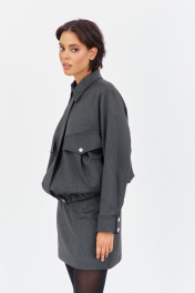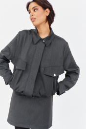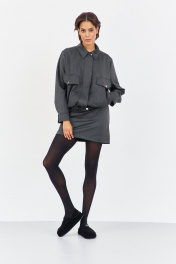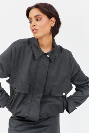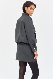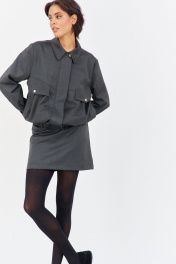 Комплект бомбер с юбкой в цвете графит. Характеристики: бомбер выполнен из костюмно-плательной ткани в цвете графит, по переду карманы-портфели с клапаном, застежка на молнию и кнопки, низ рукава и бомбера на резинке, воротник рубашечного типа. Юбка А-силуэта. застежка на потайную молнию, верх юбки обработан притачным поясом. Длина бомбера 66 см, длина рукава 62 см. Длина юбки 50 см.