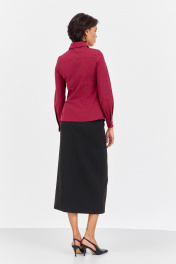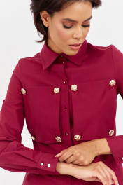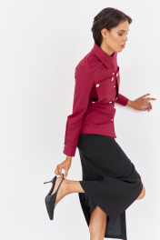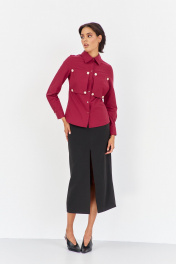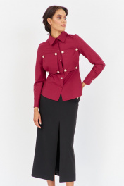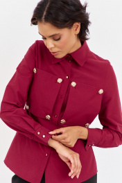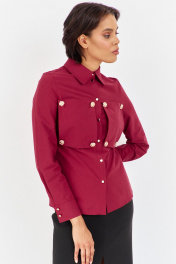 Блузка приталенного силуэта с декоративными карманами по переду. Характеристики: выполнена из блузочной ткани в цвете марсала, центральная застежка на петли и пуговицы, по переду декоративные карманы на петли и пуговицы, по спинке отрезная кокетка. Длина рубашки по переду 66 см, длина рукава 61 см.