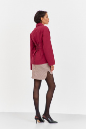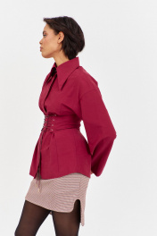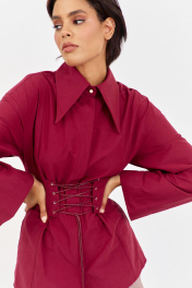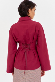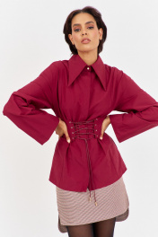 Блузка приталенного силуэта с декоративной шнуровкой по переду и спинке. Характеристики: выполнена из блузочной ткани в цвете марсала, центральная застежка на петли и пуговицы, по переду и спинке декоративная шнуровка, воротник рубашечного типа, спущенное плечо. Длина рубашки по переду 71 см, длина рукава 57 см.