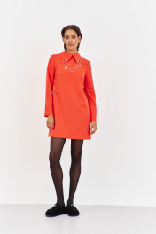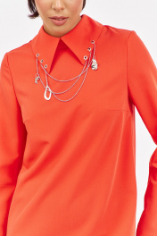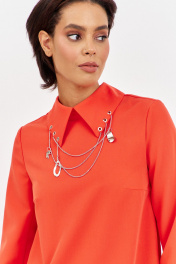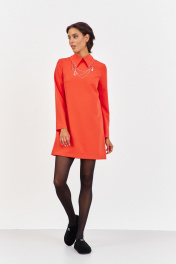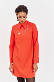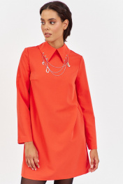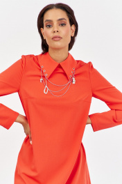 Платье с декоративным воротником в оранжевом цвете. Характеристики: выполнено из плательной ткани в оранжевом цвете, воротник рубашечного типа с декоративными подвесками, по спинке застежка-молния, рукав двухшовный. Длина платья 90 см, длина рукава 62 см.