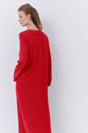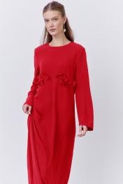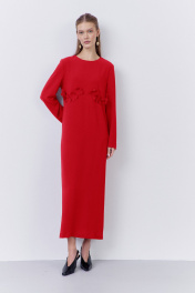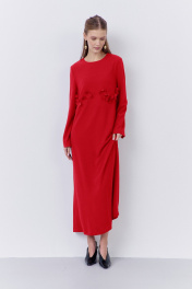 Платье прямого силуэта с декоративными цветами по переду. Характеристики: выполнено из плательной ткани в цвете бургунди, застежка-молния по спинке, по переду декоративные цветы.