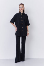 Комплект блузка свободного силуэта с брюками-клеш. Характеристики блузки: выполнена из плательной ткани в принте черный горох, центральная застежка на петли и декоративные пуговицы. Длина блузки по переду см, длина рукава см. Брюки-клеш выполнены из плательной ткани в принте черный горох.