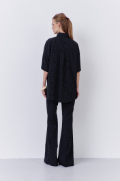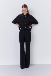 Брюки-клеш выполнены из плательной ткани в принте черный горох. Верх брюк обработан поясом, застежка пояса брюк на тесьму-молнию.