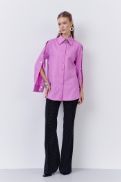 Блузка свободного силуэта с декоративными рукавами. Характеристики: выполнена из блузочной ткани в цвете сирени, центральная застежка на петли и пуговицы, по спинке отрезная кокетка, по рукавам обработаны планки на петли и пуговицы, низ рукавов обработан манжетами.