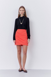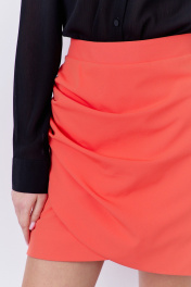 Юбка на запах. Характеристики: выполнена из плательной ткани в оранжевом цвете, по переду запах и складки, юбка на подкладке, застежка-молния по заднему полотнищу юбки, верх юбки обработан поясом-обтачкой.