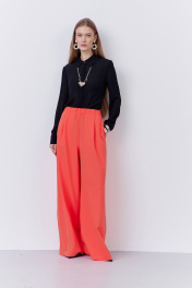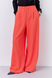 Брюки-палаццо свободного силуэта. Выполнены из плательной ткани в оранжевом цвете. Пояс брюк на резинке, в боковых швах карманы.