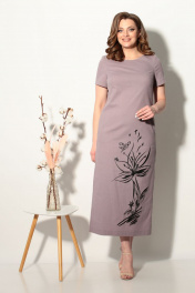 Платье женское прямого силуэта, выполнено из стрейчевой ткани с добавлением льна. По переду платья находятся нагрудные вытачки и большой печатный рисунок черного цвета внизу. По спинке имеются талиевые вытачки и молния сверху, внизу платья по снике разрез. В боковых швах находятся карманы. Длина платья по спинке 125 см.