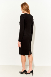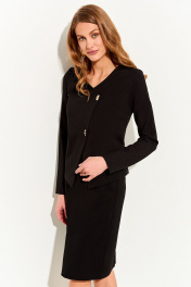 Костюм женский полуприлегающего силуэта, состоящий из юбки и джемпера, выполнен из трикотажного полотна средней плотности. Горловина V-образная; асимметричная полочка; втачные рукава; застежка на петли и пуговицы. Юбка -карандаш с завышенной линией талии на подкладке с антистатическим эффектом и поясе с резинками в боковых швах, сзади шлица, застежка на молнию. Изделие прошло тестовую стирку при температуре 30 градусов и химическую чистку: не меняет цвет и не линяет. Длина жакета в базовом размере, см 55 (размеры 44-48), 56 (размеры 50-54) Длина юбки в базовом размере, см 65 (размеры 44-48), 66 (размеры 50-54) Длина рукава в базовом размере, 64 см