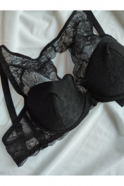 Бюстгальтер бралет. Выполнен из цветочного кружева. По передней части кружевная горловина с выемкой в райне ложбинки по груди. Чашка полупоролон на карсках. Застёжка 2*3 крючка, бретели с регулировой по длине.