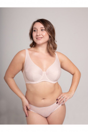 Бюстгальтер с мягкой чашкой на каркасах, больших размеров. Изготовлен из плотного трикотажного полотна. Чашка высокая закрытая, с дополнительными поддерживающими деталями по бокам. Бретели широкие усиленные. Края верха чашки обработаны окантовкой. Верхняя часть чашки однослойная , нижняя часть двухслойная с хлопковой подкладкой. Чашка с Т-образным швом приподнимает, округляет и поддерживает грудь большого размера. U-образное расположение бретелей. Бретели из эластичной ленты с регулировкой по длине. Застёжка сзади на крючки и петли, 2*3 крючка.