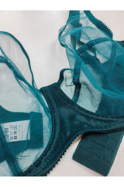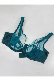Бюстгальтер прозрачный с мягкой чашкой на каркасах, больших размеров. Изготовлен из сетчатого полотна. Чашка высокая закрытая, с дополнительными поддерживающими деталями по бокам. Бретели широкие усиленные вставками из функциональной сетки. Бюстгальтер выполнен из прозрачного сетчатого полотна, края верха чашки обработаны окантовкой, декоративный бант на ластовице. Верхняя часть чашки однослойная (из прозрачной сетки), нижняя часть двухслойная. Чашка с Т-образным швом приподнимает, округляет и поддерживает грудь большого размера. U-образное расположение бретелей. Бретели из эластичной ленты с регулировкой по длине. Застёжка сзади на крючки и петли, 2*3 крючка.