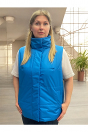 Жилет женский утеплённый, прямого силуэта, с центральной застежкой на планку, которая фиксируется потайными кнопками. По спинке и полочкам выполнена стежка. На полочках обработаны прорезные карманы с втачной листочкой. Воротник втачной. На обтачки пройм настрочена эластичная тесьма, образуя сборку. Внутри изделия подкладка из полиэстера.