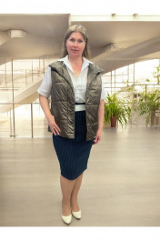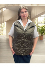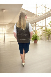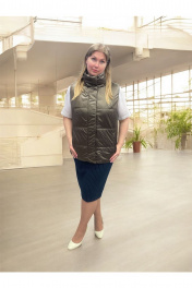 Жилет женский утеплённый, прямого силуэта, с центральной застежкой на планку, которая фиксируется потайными кнопками. По спинке и полочкам выполнена стежка. На полочках обработаны прорезные карманы с втачной листочкой. Воротник втачной. На обтачки пройм настрочена эластичная тесьма, образуя сборку. Внутри изделия подкладка из полиэстера.