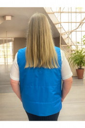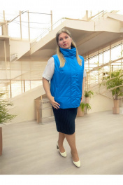 Жилет женский утеплённый, прямого силуэта, с центральной застежкой на планку, которая фиксируется потайными кнопками. По спинке и полочкам выполнена стежка. На полочках обработаны прорезные карманы с втачной листочкой. Воротник втачной. На обтачки пройм настрочена эластичная тесьма, образуя сборку. Внутри изделия подкладка из полиэстера.