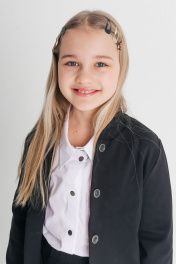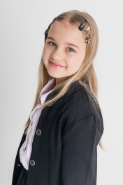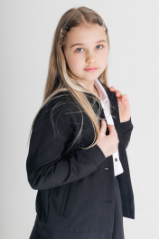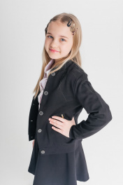 Школьный трикотажный жакет для девочки прямого силуэта типа бомбер. По переду расположены карманы. На левом кармане расположена нашивка «FRANTishka». Воротник стойка. Застёжка однобортная на пять пуговиц. Спинка цельная. Рукава с манжетами. Низ изделия обработан поясом.