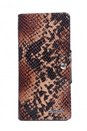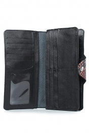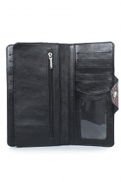 Портмоне закрывается клапаном на кнопку, с украшением на передней части корпуса, с обстрочкой краев, с краями в загибку и в обрезку, с обработкой обрезных краев. Размеры: 90x185x6