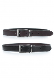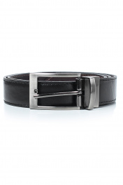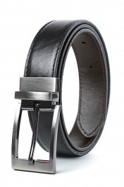 Ремень в обрезку, с обработкой краев, с обстрочкой края, с пряжкой на ремне, с двумя шлевками, двухсторонний. Фурнитура - черный никель. Размеры: 1150x3x28