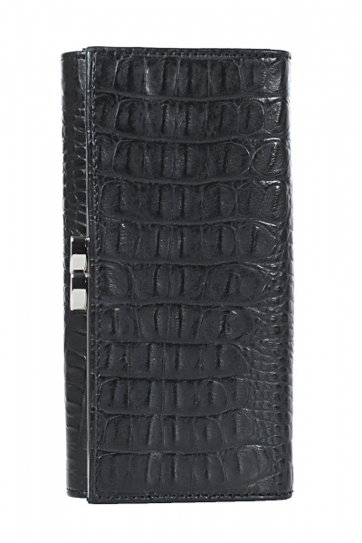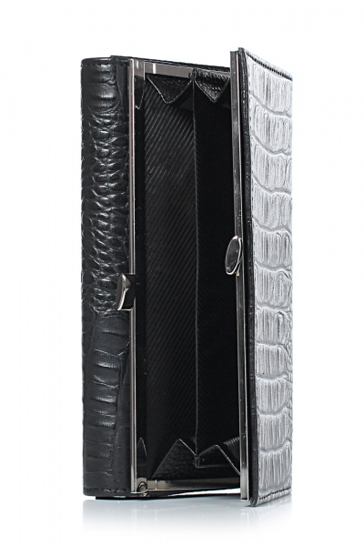 Портмоне закрывается клапаном на кнопку, с карманом на задней части корпуса, закрывающимся на рамочный замок, с открытыми карманами, с краями в загибку. Размеры: 180x90x35