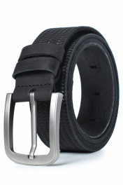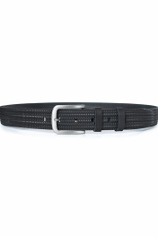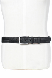 Ремень в обрезку, с обработкой изнанки, с декоративным тиснением ремня, с пряжкой и шлевкой на запряжнике, с одной передвижной шлевкой. Цвет фурнитуры - черный никель. Размеры: 1350x3x40