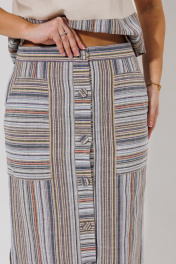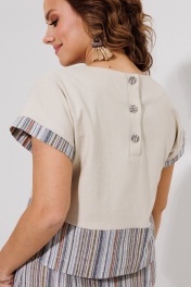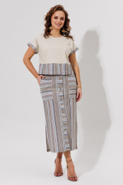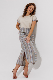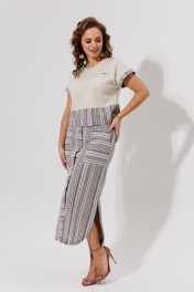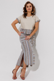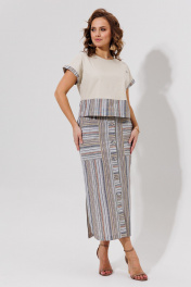 Комплект женский, состоящий из блузки и юбки, из натурального льна. Блузка прямого силуэта с цельнокроенным коротким рукавом, по низу переда и спинки притачная деталь из отделочной ткани, по низу рукава манжеты из отделочной ткани. Перед блузки украшен металлической пришивной фурнитурой. На спинке блузки функциональная застежка-планка с пуговицами из отделочной ткани в полоску. Юбка на поясе, прямого силуэта до середины икры с фигурными разрезами по низу. Спереди юбки есть функциональная застежка на петли и пуговицы, а также накладные карманы. Длина изделия/рукав: Блуза 50/29, юбка 87