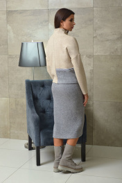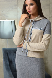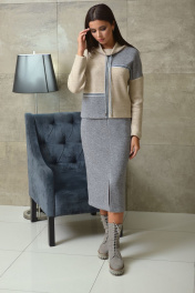 Костюм женский, состоящий из джемпера и юбки, выполнен из трикотажного мягкого полотна. Джемпер прямого силуэта, с рукавом мягкой формы, линия плеча спущена. Перед и спинка имеют горизонтальные и вертикальные членения, детали которых состоят из разных цветов. Подчёркивает такой контраст цветов декоративная тесьма, расположенная на швах передней и задней частях спинки. Воротник-стойка, широкий, с протянутым через люверсы в верхней части декоративным шнуром, который позволяет при желании уютно сузить периметр горловины. Юбка прямая, длиной ниже колена. В пояс вставлена резинка. По переду юбки- разрез в шве, верхний уровень которого находится немного выше колена. Длина изделие/рукав: Жакет 49/60, юбка 75