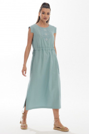 Платье женское прямого силуэта выполнено из льняной ткани с добавлением вискозы. Горловина круглая с застежкой на спинке на пуговицу. Рукав фантазийной формы. На центральной детали переда расположена вышивка в народном стиле. На талии настрочены короткие кулиски по центру спинки и переда, в которые продет декоративный шнур. В боковых швах по низу имеются разрезы по обеим сторонам. Длина изделие/рукав: 122/3,5