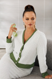 Костюм женский изготовлен из трикотажной ткани.Низ жакета, рукава и край борта обработан довязом. Жакет имеет v-образный вырез. Застёгивается на четыре петли пуговицы. Юбка прямая, на подкладке, на поясе, слегка зауженная к низу. Длина ниже линии колена. Средний шов юбки заканчивается шлицей. Длина Жакет/рукав 55/61, длина юбка 72