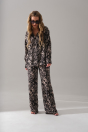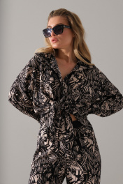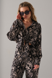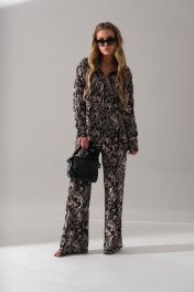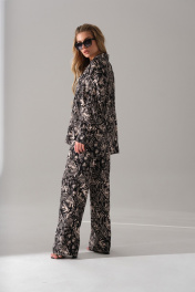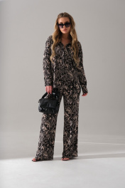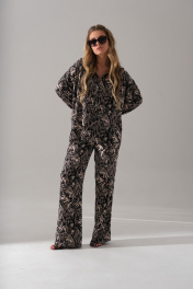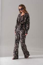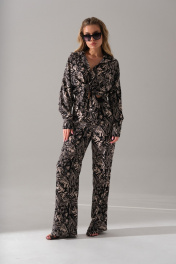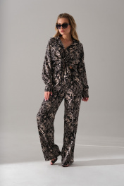 Костюм женский рубашка и брюки выполнена из текстильного полотна костюмно-плательной группы. Рубашка прямая со спущенной линией плеча. По переду расположена планка застёгивающаяся на петли и пуговицы. Воротник рубашечного типа нас стойке. Рукава одношовные, заканчивающиеся манжетой. Перёд рубашки по линии низа чуть короче,относительно спинки. По боковым швам обработаны разрезы. Брюки широкие. Верх брюк на резинке. Длина изделия: рубаша - 71 см, брюки - 106 см; Длина рукава - 62 см.