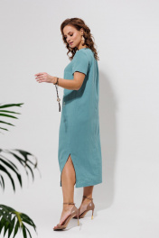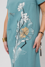 Платье женское слегка расклешённое к низу, льняное. На переде расположена декоративная печать. Нагрудная вытачка идёт с боковых швов. На правой половине расположен накладной карман. Спинка со средним швом, в котором расположена застёжка горловины на одну пуговицу. Горловина круглой формы. По боковым швам имеются разрезы. Рукава короткие, одношовные. Длина изделие/рукав: 114/21 см.