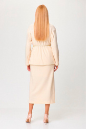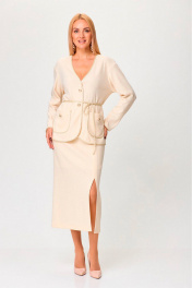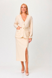 Комплект 2-х предметный. Выполнен из вязаного трикотажного полотна. Жакет-кардиган без подкладки, свободного прямого кроя, со спущенной линией плеча. Рукав полной длины, прямой. Застежка центральная на две петли-пуговицы. Большие накладные карманы с декоративной пуговицей. По карманам, низу рукавов. Вдоль борта и низа изделия настрочена декоративная тесьма-косичка. Из этой-же тесьмы, в комплект входит длинный пояс шнурок. Юбка прямого силуэта на трикотажной подкладке. Верх обработан поясом с широкой, круговой резинкой. На юбке один шов с разрезом. Конструкция юбки выполнена так, что разрез можно крутить и ставить его в нужное место (спереди, с зади, с боку, на ноге). Посадка по фигуре не деформируется, что позволяет менять образ.