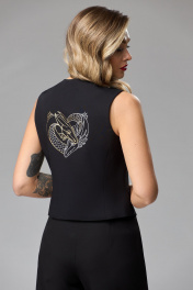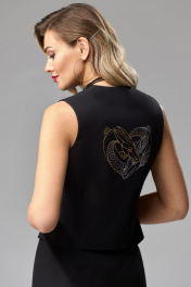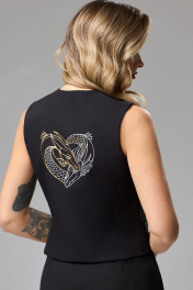 Жилет полуприлегающего силуэта из костюмной ткани. Застежка центральная на 5 петель и пуговиц. Перед с рельефами и втачной листочкой. Горловина фигурной формы. Низ переда с острыми концами. Спинка с рельефами и декоративной печатью ввиде дракончиков. Жилет на подкладке. Фурнитура может быть изменена с сохранением художественного образа. Длина жилета (по спинке) - 48 см.