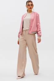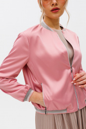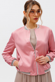 Бомбер прямого силуэта со слегка спущенным плечом из атласной ткани средней плотности, собран на довяз понизу. Перед с рельефами и карманами на молнии. Застежка на молнию по переду. Горловина обработана довязом. Рукав втачной одношовный, собран по низу на довяз. Жакет на подкладке. Длина бомбера - 58 см, длина рукава - 57 см.