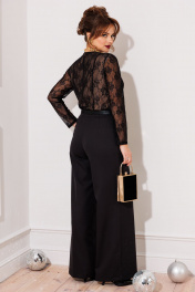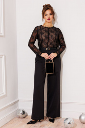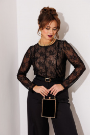 Джемпер прилегающего силуэта выполнен из эластичного кружева на сетке. Перед и спинка с рельефами. Рукав втачной одношовный. Перед и спинка на подкладке. Длина джемпера: 58 см, длина рукава джемпера 60 см.