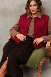 Жилет прямого свободного силуэта из теплой ткани "барашек". Перед с настрочными карманами. Застежка на 3 петли и пуговицы. Жилет на подкладке. Длина жилета - 52 см.