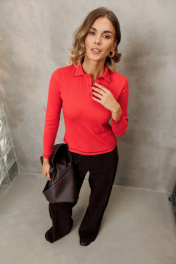 Джемпер приталеного силуэта с воротником поло из трикотажного полотна. Рукав втачной одношовный. Длина джемпера - 57 см, длина рукава - 60 см