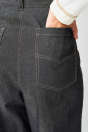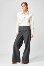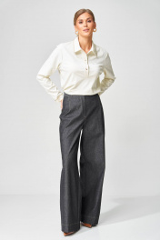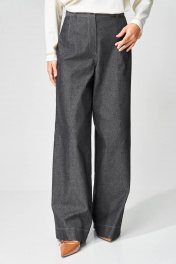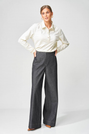 Брюки расширеные книзу на притачном поясе из джинсовой хлопковой ткани. По поясу настрочены шлевки. По передним и задним частям брюк вытачки. На задних частях брюк настрочены карманы. Карманы, вытачки, пояс, низ брюк отделаны отделочной строчкой. Длина брюк с учетом пояса - 109 см. Данная модель прекрасно сочетается с другими моделями из нашей коллекции 15409, 15377, 15416, 15408/1. Создайте гармоничный образ, комбинируя эти изделия!