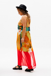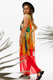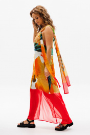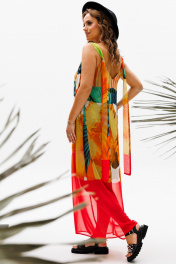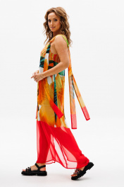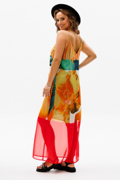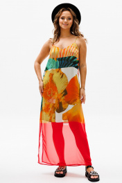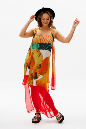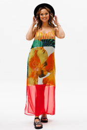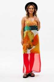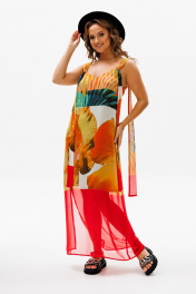 Сарафан прямого силуэта на регулируемых бретелях из шифона с ярким летним принтом. Перед с нагрудной вытачкой. К бретелькам крепятся декоративные детали. Платье на подкладке их шифона. Длина платья - 114 см.