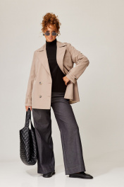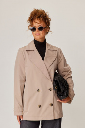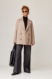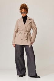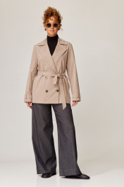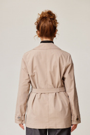 Тренч свободного прямого силуэта из плащевой ткани. Перед с нагрудной вытачкой заведеной под лацкан. Спинка со средним швом. Застежка двубортная на 4 пуговицы. В боковых швах карманы. Рукав одношовный втачной. По низу рукава паты с застежкой на петлю и пуговицу. Паты протянуты в шлевки. Воротник пиджачного типа. К тренчу прилагается пояс из основной ткани. В боковых швах для него шлевки. Тренч на подкладке. Длина тренча по спинке - 72 см, длина рукава - 62 см.
