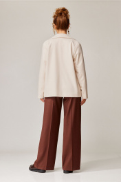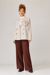 Жакет свободного прямого силуэта из плотной теплой трикотажной ткани с рисунком "ёлка". Перед с нагрудной вытачкой переведенной под лацкан. По переду прорезной карман с листочкой. Застежка двубортная на 4 пуговицы. Воротник пиджачного типа. Рукав одношовный втачной со слегка спущенным плечом. Жакет на подкладке. На правой части переда съемное украшение -цветок из основной ткани. Длина жакета - 64 см, длина рукава - 59 см.
