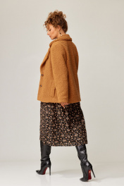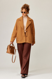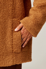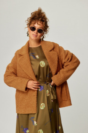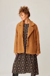 Куртка свободного силуэта выполнен из пальтовой ткани "Барашек". Воротник пиджачного типа с закругленными концами. Застежка на две петли и пуговицы. Перед с рельефными швами, в которых обработаны карманы с листочками с настрочными концами. Рукав втачной двухшовный. Куртка на подкладке. Длина куртка - 67 см, длина рукава - 62 см.