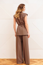 Костюм состоит из жилета и брюк, выполеных из костюмной ткани. Жилет полуприлегающего силуэта с воротником пиджачного типа. Перед с рельефами, талиевой вытачкой и декоративным клапаном. Застежка центральная однобортная на 2 петли и пуговицы. Спинка со средним швом и рельефами. Вдоль оката рукава выполнена декоративная планка. К жилету прилагается тонкий пояс из основной ткани. Брюки расширеные книзу с притачным поясом. Спереди застежка гульфик на молнии и с петлей и пуговицей по поясу. По задней частям брюк вытачки. В боковых швах карманы с наклонным входом. По поясу широкие шлевки. Брюки со срелками. Длина жилета - 71 см, длина брюк с учетом пояса - 109 см.