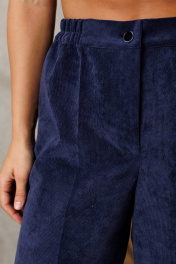 Костюм состоит из блузки и брюк. Блузка свободного силуэта из струящейся шифоновой ткани. Перед и спинка с кокеткой и сборкой. Рукав спущенный свободный с резинкой понизу. Вдоль линии кокетки и рукава вставлена рюша. Горловина V-образной формы с воротником стойкой переходящей в бант. Брюки палаццо с притачным поясом из мягкой вельветовой ткани. Спереди застежка гульфик на молнии и петлей и пуговицей по поясу. По задней частям брюк вытачки. Пояс с резинкой в боковых частях. Брюки с заутюженными стрелками. Длина блузки - 67см, длина рукава - 60 см. Длина брюк с учетом пояса - 109 см.