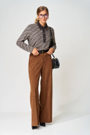 Джемпер прямого силуэта с воротником поло из трикотажной ткани с оригинальным рисунком. Рукав втачной одношовный. По низу изделия, по низу рукава и по воротнику проложена отделочная строчка. Брюки палаццо с притачным поясом из мягкой вельветовой ткани. Спереди застежка гульфик на молнии и петлей и пуговицей по поясу. По задней частям брюк вытачки. Пояс с резинкой в боковых частях. Брюки с заутюженными стрелками. Длина джемпера- 66 см, длина рукава - 60 см. Длина брюк с учетом пояса - 109 см.