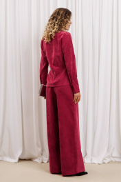 Костюм состоит из блузки и брюк. Блузка оригинальная приталенного силуэта из вельветовой ткани. Перед с подрезом под грудью, сборкой в районе груди и талиевыми вытачками. Затсежка на петли и пуговицы. Горловина V-образной формы. Спинка со средним швом и талиевыми вытачками. Рукав втачной со сборкой по окату и с манжетой по низу. Манжета высокая с двумя петлями и пуговицами. Длина блузки - 63 см, длина рукава блузки - 64 см. Брюки палаццо с притачным поясом из мягкой вельветовой ткани. Спереди застежка гульфик на молнии и петлей и пуговицей по поясу. По задней частям брюк вытачки. Пояс с резинкой в боковых частях. Брюки с заутюженными стрелками. Длина брюк с учетом пояса - 109 см.