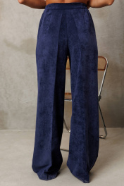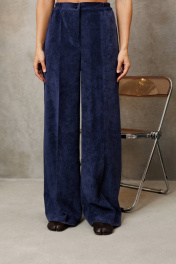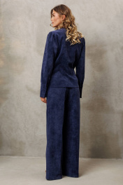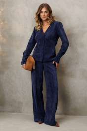 Костюм состоит из блузки и брюк. Блузка оригинальная приталенного силуэта из вельветовой ткани. Перед с подрезом под грудью, сборкой в районе груди и талиевыми вытачками. Затсежка на петли и пуговицы. Горловина V-образной формы. Спинка с талиевыми вытачками. Рукав втачной со сборкой по окату и с манжетой по низу. Манжета высокая с двумя петлями и пуговицами. Длина блузки - 63 см, длина рукава блузки - 64 см. Брюки палаццо с притачным поясом из мягкой вельветовой ткани. Спереди застежка гульфик на молнии и петлей и пуговицей по поясу. По задней частям брюк вытачки. Пояс с резинкой в боковых частях. Брюки с заутюженными стрелками. Длина брюк с учетом пояса - 109 см.