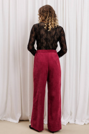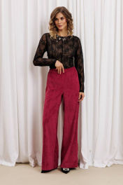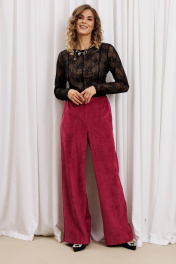 Костюм состоит из блузки и брюк. Блузка приталенного силуэта из кружевной сетки. Перед и спинка с рельефами и средним швом. Рукав втачной. Перед и спинка на телесной подкладке. Длина джемпера - см, длина рукава джемпера - см. Брюки палаццо с притачным поясом из мягкой вельветовой ткани. Спереди застежка гульфик на молнии и петлей и пуговицей по поясу. По задней частям брюк вытачки. Пояс с резинкой в боковых частях. Брюки с заутюженными стрелками. Длина брюк с учетом пояса - 109 см.