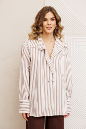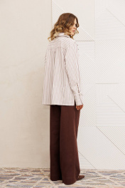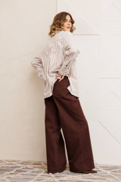 Рубашка свободного силуэта из хлопковой ткани в полоску. Перед с двубортной застежкой и карманом в районе груди. Воротник со стойкой. Спинка с кокеткой и складкой. Рукав втачной рубашечный с высокой манжетой на 2 петли и пуговицы. Длина рубашки - 70 см. Длина рукава - 60 см. Брюки расширеные книзу на притачном поясе из джинсовой хлопковой ткани. По поясу настрочены шлевки. По передним и задним частям брюк вытачки. На задних частях брюк настрочены карманы. Карманы, вытачки, пояс, низ брюк отделаны отделочной строчкой. Длина брюк с учетом пояса - 109 см