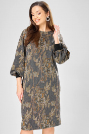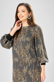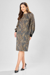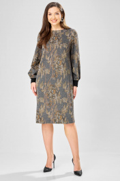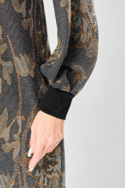 Платье прямого силуэта из плотного трикотажного полотна с рисунком и с люрексом. Перед с нагрудными вытачками. Спинка со средним швом. Горловина лодочкой обработана планкой. Рукав одношовный втачной по низу со складками собранными на манжету-довяз. Длина платья-100см, длина рукава-60см.